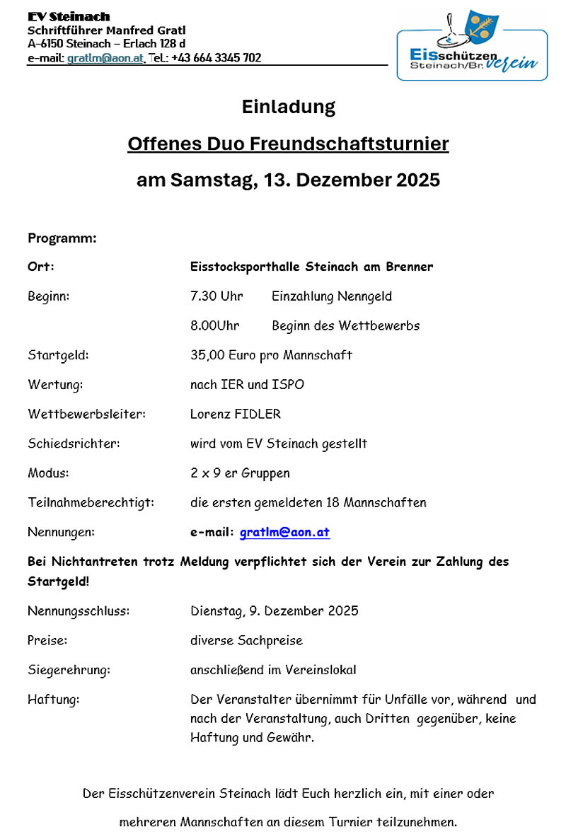 EV Steinach ZVR-Nr.: 544918917 Obmann: Alois Leitner Tel:+43 (0)664 - 91 08 597 Postempfänger : Manfred Gratl A-6150 Steinach – Erlach 128 d Tel.: +43(0)5272 / 6113 E-Mail: Manfred Gratl Homepage: EV Steinach