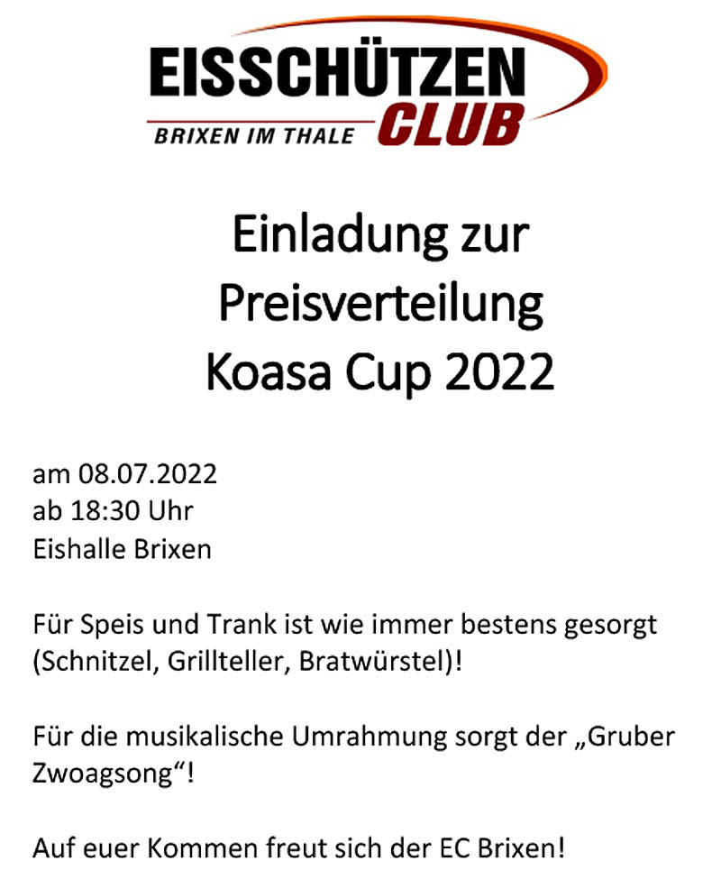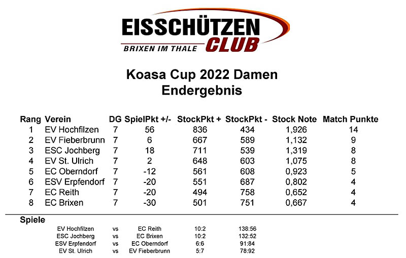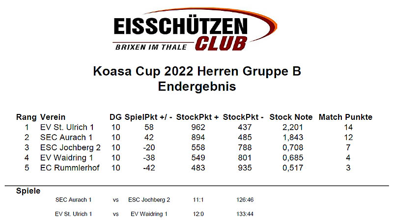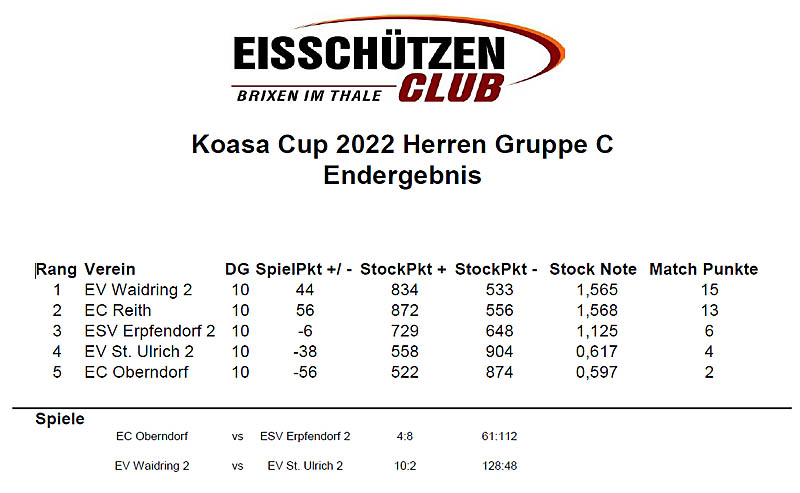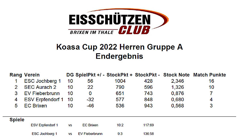 kämpfen: 1. Platz Gruppe A: ESC Jochberg 1 2. Platz Gruppe A: SEC Aurach 2 1. Platz Gruppe B: EV St. Ulrich 1 2. Platz Gruppe B: SEC Aurach 1 1. Platz Gruppe C: EV Waidring 2 2. Platz Gruppe C: EC Reith Das Finale wird, wie bei der Sitzung vereinbart,