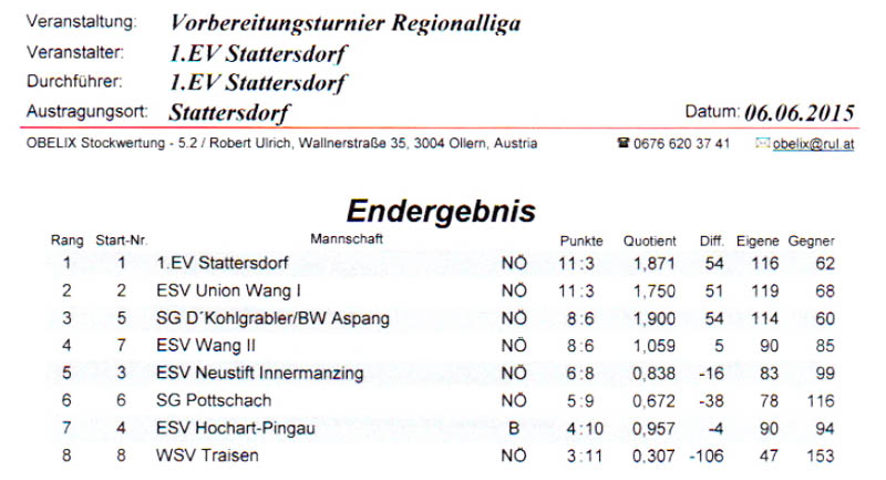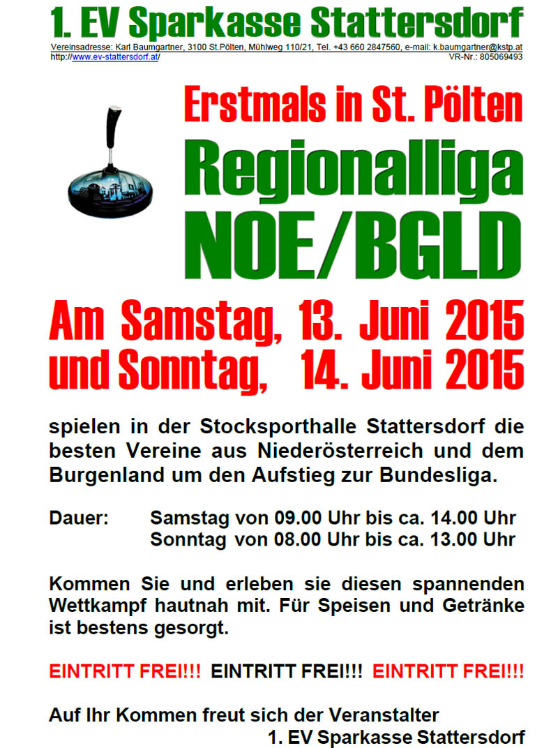 Nichts desto trotz wird der 1. EV Sparkasse Stattersdorf in der nächsten Woche auf der eigenen Anlage einen Spitzenplatz in der Regionalliga anpeilen. Die beiden Erstplatzierten der Regionalliga steigen dann zur Bundesliga auf, welche dieses Jahr auch in Niederösterreich ausgetragen wird, nämlich am Samstag, 27.06.15 und Sonntag, 28.05.15 in Wang und Seitenstetten.