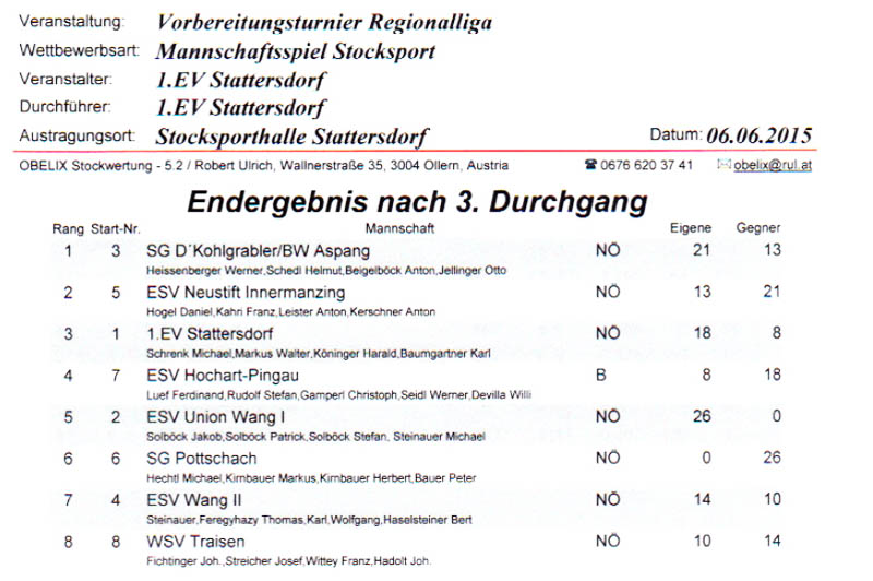 Heute wurde in der Stocksporthalle Stattersdorf ein Vorbereitungsturnier für die Regionalliga NÖ/Bgld., welche am Samstag, 13.06.15, Beginn 9.00 Uhr und Sonntag, 14.06.15, Beginn 8.00 Uhr in Stattersdorf stattfindet, ausgetragen. Nach der Vorrunde konnte der 1. EV Sparkasse Stattersdorf noch den 1. Platz belegen, mit einer vermeidbaren Niederlage im 2. Finalspiel gegen den späteren Sieger ESV D´Kohlgrabler musste man sich aber dann schlussendlich mit dem 3. Gesamtplatz begnügen. |
