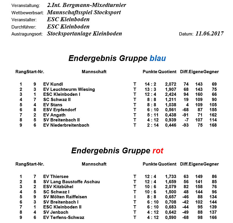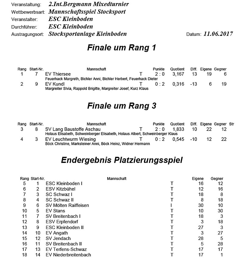 2. Int. Bergmann Mixed Turnier am Sonntag, den 11. Juni 2017 in Kleinboden |