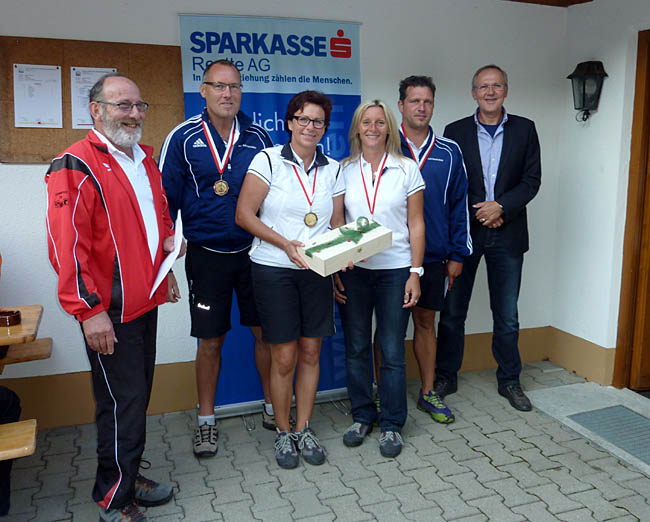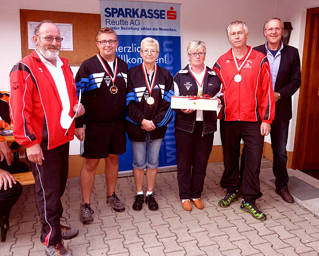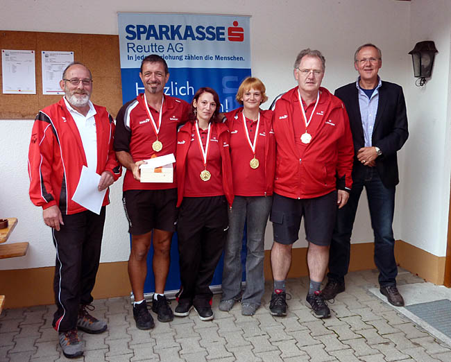 3. Rang: SV Lechaschau 1 Kuen Ulli, Greinwald Elke, Rief Thomas, Geinwald Wolfgang mit Obmann Eugen Winkler (links) und Präsident vom gesamten SV Reutte Manfred Storf (rechts) |