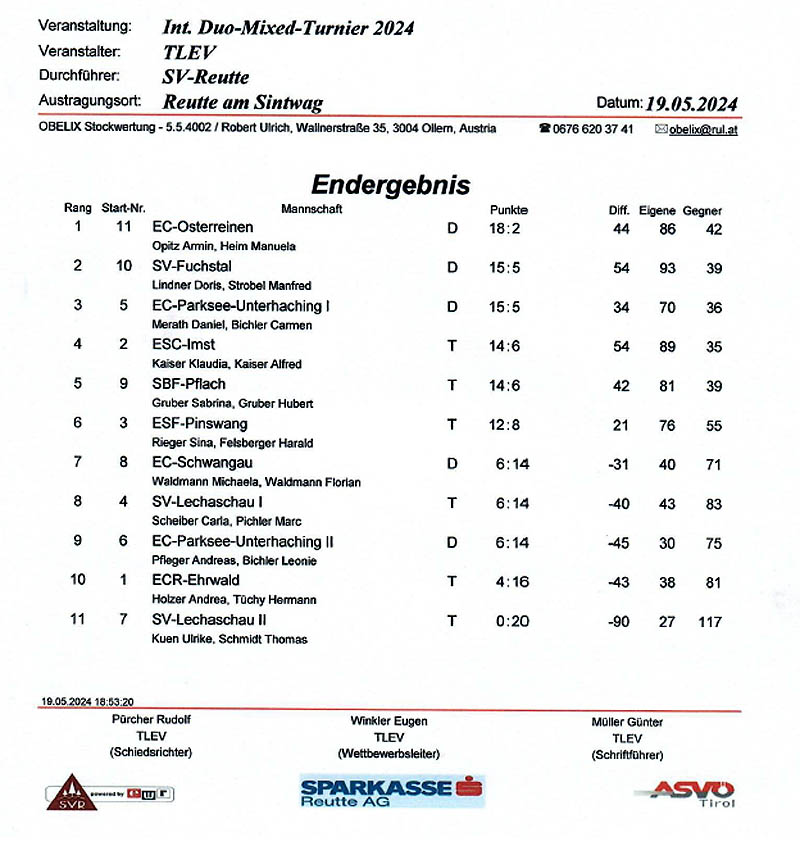 11. Rang: SV Lechaschau 3 Kuen Ulrike, Schmidt Thomas |