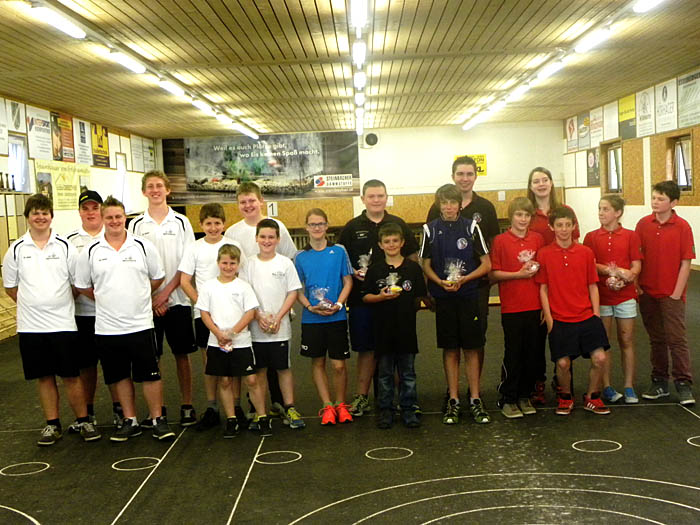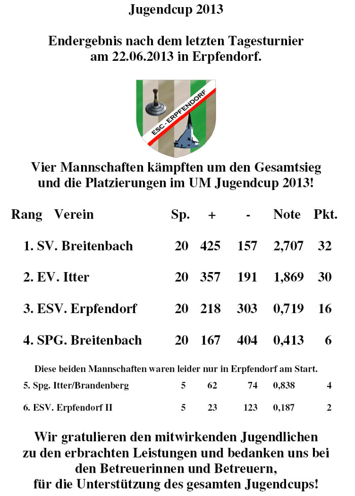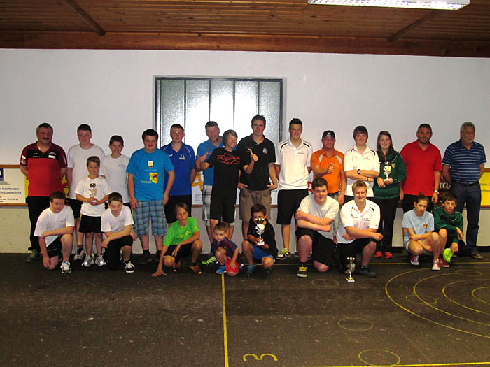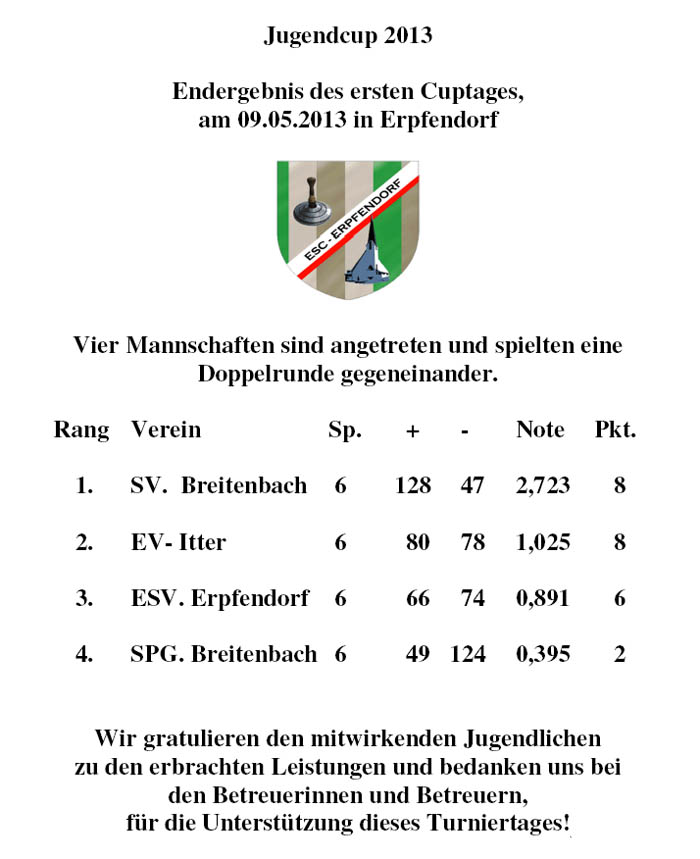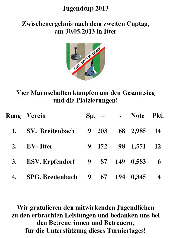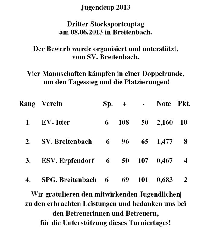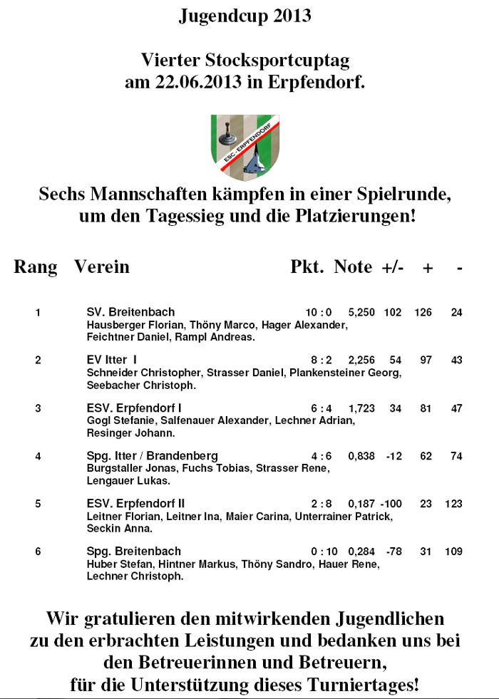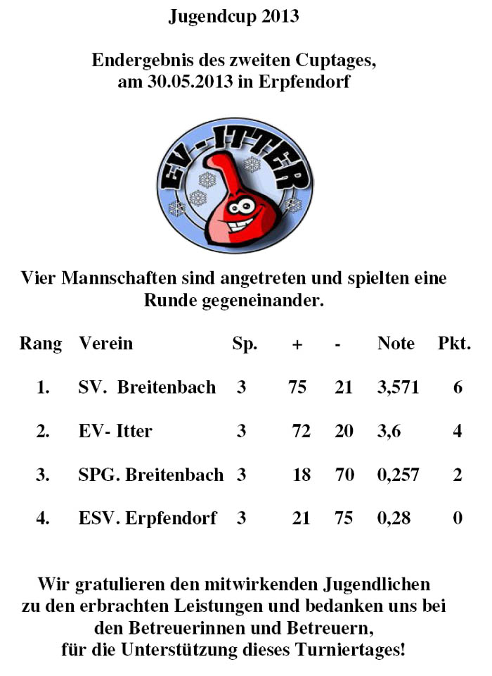 2. Turniertag in Itter von links: Jgd. B. Wolfgang Strasser 2. Rang: EV Itter - 1. Rang: SV Breitenbach - 3. Rang: Spg. Breitenbach - 4. Rang: ESV. Erpfendorf mit den Betreuern Thöny Herbert, Huber Hermann und Müller Brigitte |